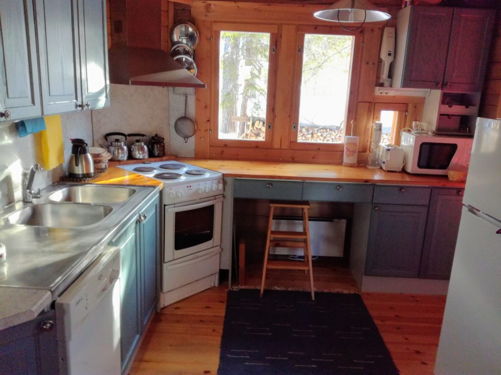 Keittiö: sähköliesi uunilla, puuhella, astianpesukone, mikro, jenkkijääkaappi pienellä pakastinosalla, leipäkone